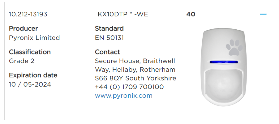 EN50131-2-4:2008, EN50131-5-3:2005+A1:2008, PD6662:2017